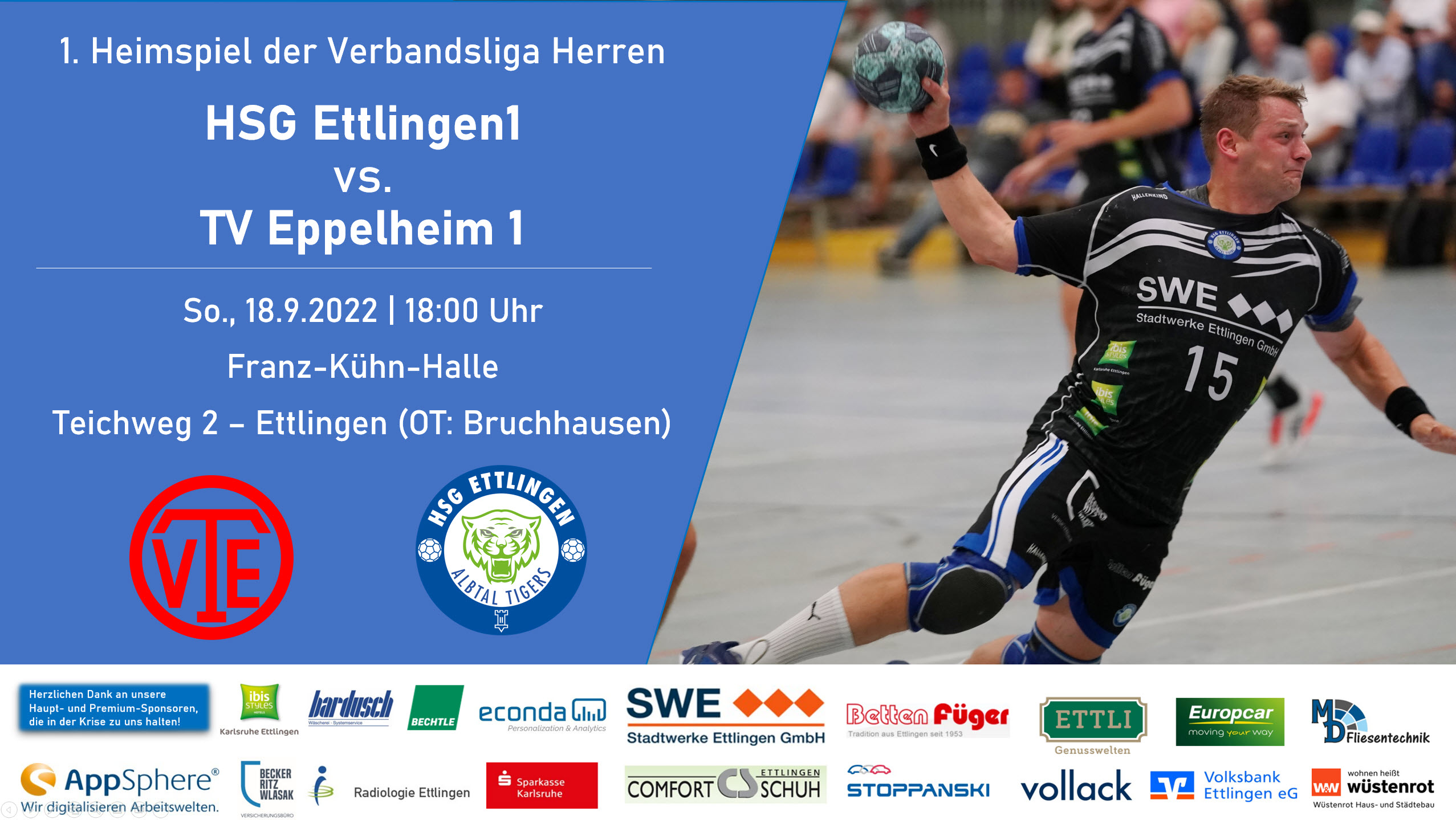 Am Sonntag, den 18. September findet der 1. Heimspieltag der HSG Ettlingen in der Franz-Kühn-Halle statt. Nachdem unsere Herren 1 am vergangenen Wochenende bereits beim Badenligaabsteiger aus Hockenheim punkten konnten, wartet mit dem TV Eppelheim nun der zweite Badenligabsteiger auf unsere Sieben. Das Team aus der Region Heidelberg ist kein Unbekannter im Albtal. Vor dem Aufstieg in die Badenliga lieferten sich beide Teams immer harte, aber faire Matches. Das ist aber ein paar Jahre her und der Gast hat sich seither verändert und ist für Chef-Coach Burlakin ein ernstzunehmender und auch unbekannter Gegner.
