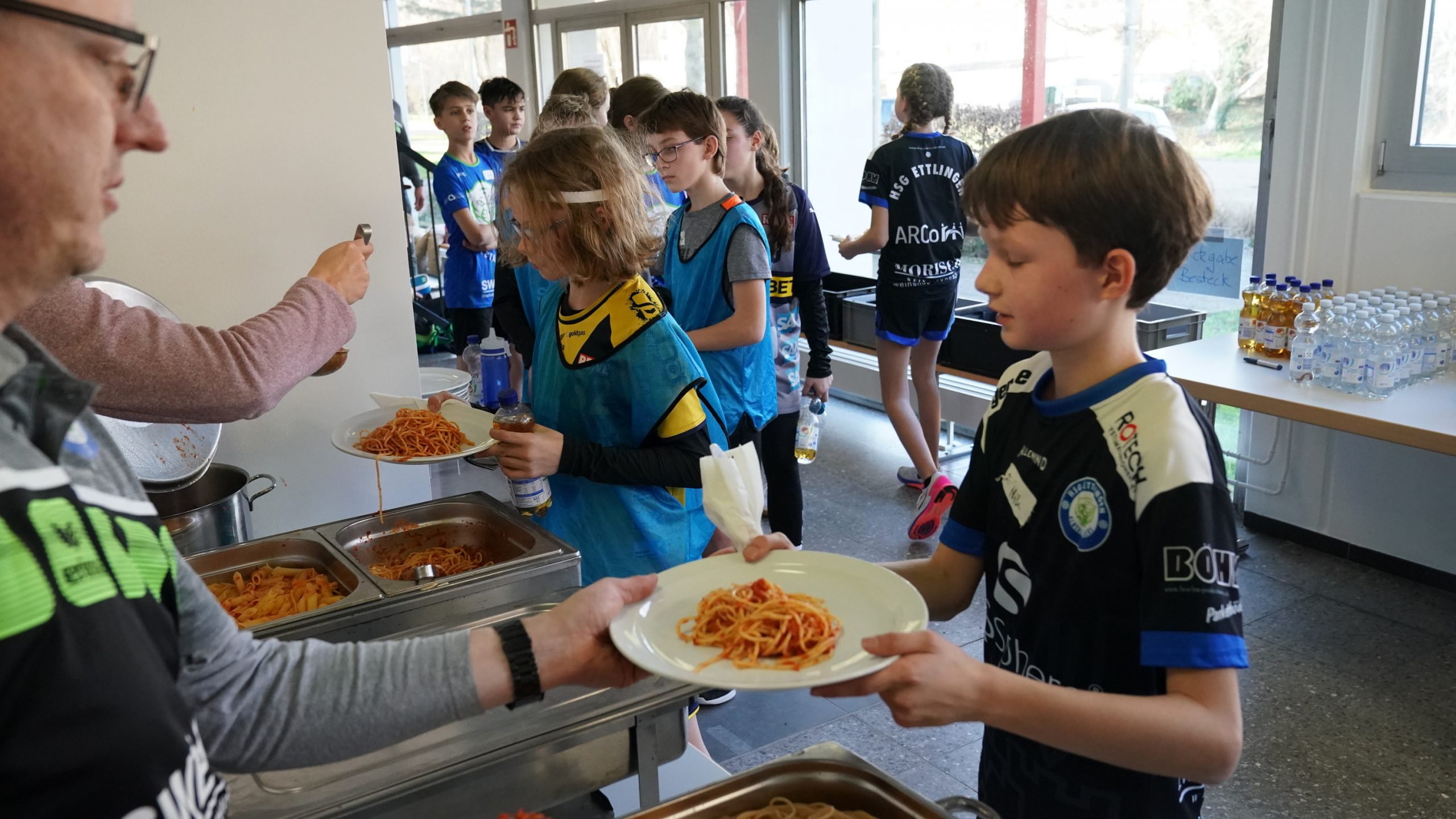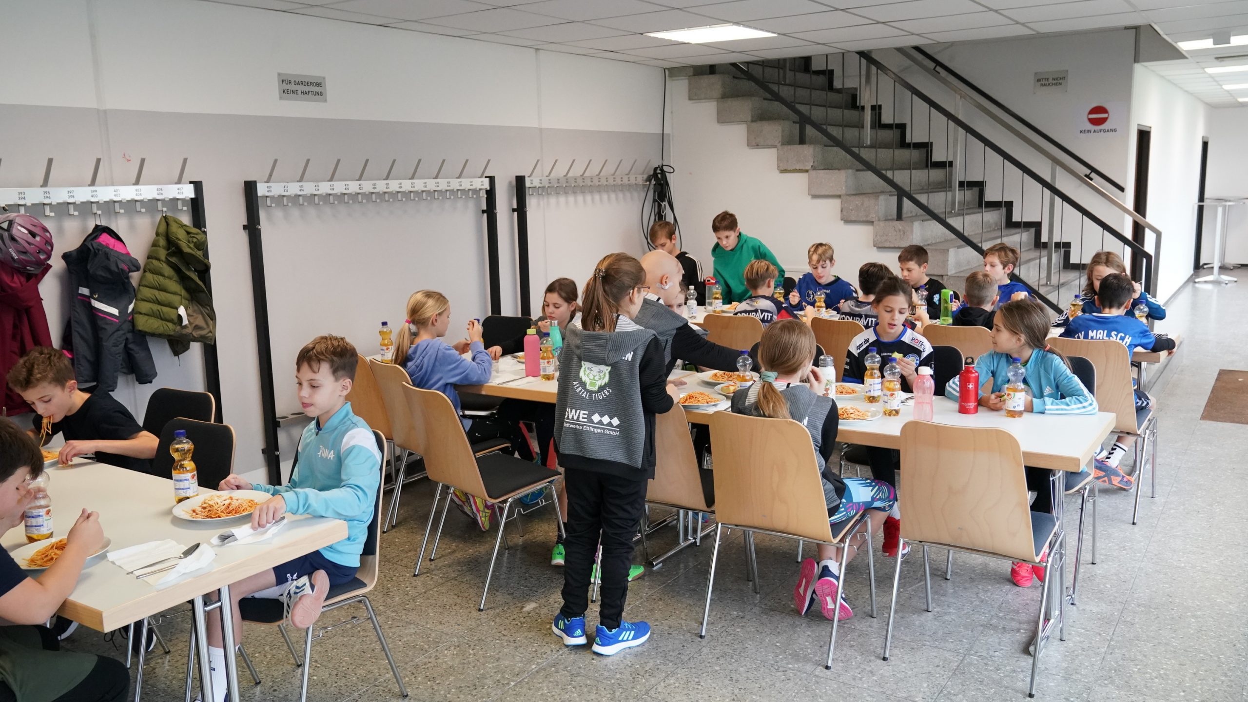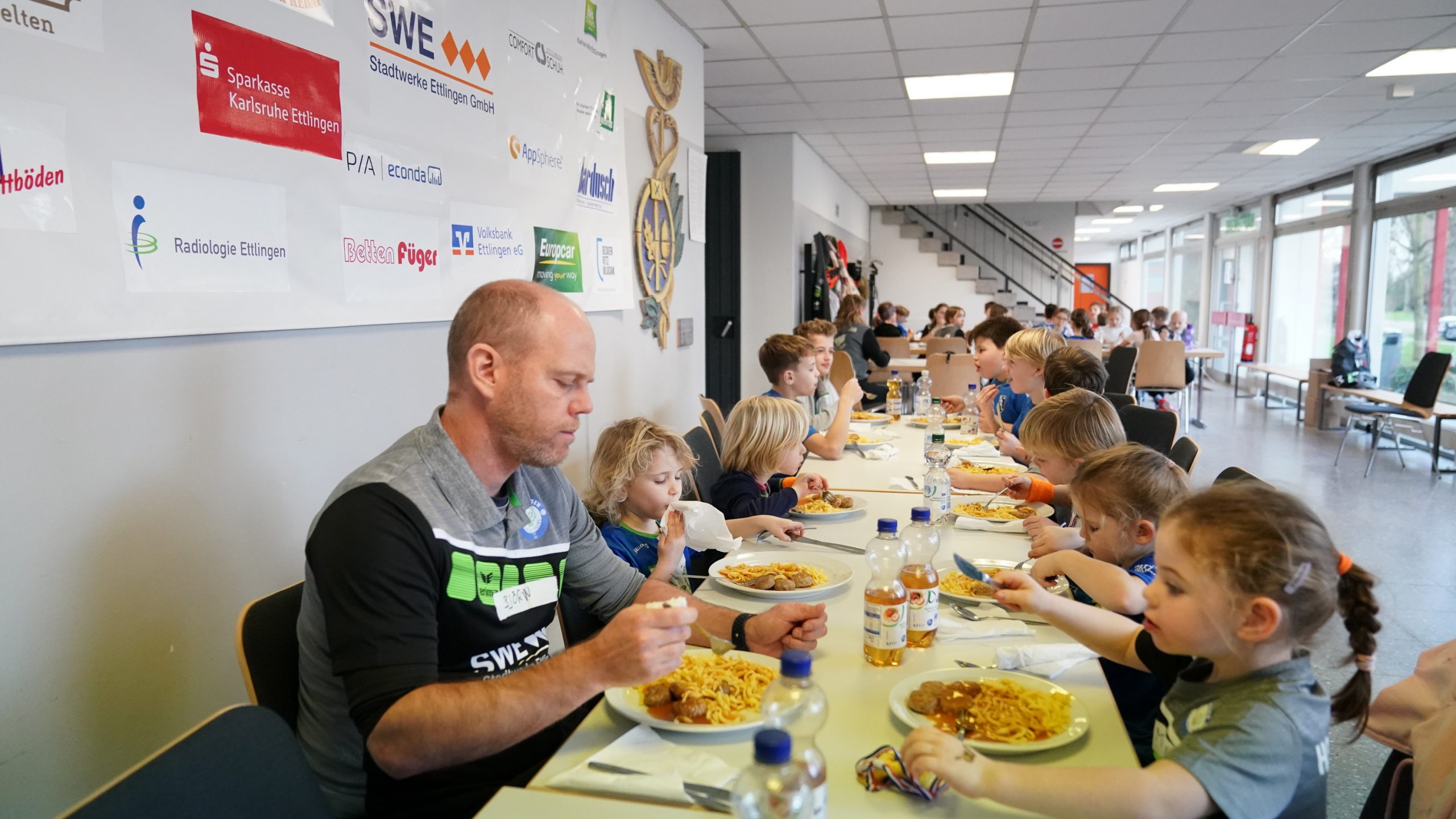 Mit 78 Kids, welche über die Weihnachtsfeiertage Unmengen an Energie angesammelt hatten, war Campleiter und Jugendtrainer Hagen Harich und sein 12-köpfiges Trainer- und Betreuerteam gefordert. Doch mit viel Routine und der nötigen Portion Gelassenheit wurde die “Power-Bande” mit vielseitigen Übungen und Spielen systematisch müde gemacht und der überschüssigen Energie beraubt. In den Pausen sorgte ein Elternteam rund um Joachim Rutschmann für die nötige Flüssigkeits- und Vitaminzufuhr. Das leckere Mittagessen wurde am ersten Camptag vom italienischen Restaurant „DaPino“ und am zweiten Tag vom Ettlinger Mittagstisch-Restaurant und Caterer „Kochtöpfle“ geliefert. Beim Kochtöpfle möchten wir uns ganz besonders bedanken, denn dieses spendete das Essen am zweiten Tag! Herzlichen Dank, liebe Michaela Jacobs mit Team