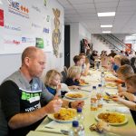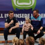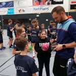 Am Ende des zweiten Tags startete das letzte Highlight des Camps: die Frage- und Autogrammstunde mit David Schmidt und Bastian Rutschmann. Die Kids hatten nun die Gelegenheit beiden Vollbluthandballern ihre Fragen zu stellen. Und so wurde David mit Fragen gelöchert wie: “Wieviel Tore hast Du bislang geschossen?“, “Wann hast Du mit dem Handballspielen angefangen?”, „Was machst Du sonst so in Deiner Freizeit?“. Bastian Rutschmann musste die Frage meistern: „Was war das wichtigstes Spiel in Deiner Handballkarriere?“ bzw. „Hast Du schon bei den Rhein-Neckar-Löwen gespielt?“. Beide gaben all ihre Erfahrungen und Empfehlungen preis und die Kids hörten sehr aufmerksam zu, wie sie es auch soweit bringen können. Aber es gab auch eine Frage an die Kids: „Wer will später einmal in der Nationalmannschaft spielen?“. Erwartungsgemäß gingen ca. 40 Hände hoch! Es sieht also gut aus für Alfred Gislason. Der Nachwuchs ist auf dem Weg.