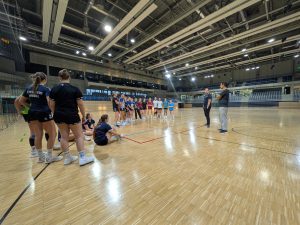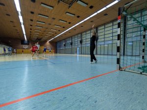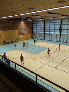 Der zweite Tag startete „gnädig“: Das erste Training war erst um 11:00, sodass nach einem späten Frühstück die meisten doch einigermaßen ausgeruht in der Halle des Instituts für Sport- und Sportwissenschaften der Uni Heidelberg antraten. Dort standen zwei Trainingseinheiten auf dem Programm: Während in der ersten Einheit das Tempospiel und das Zusammenspiel im Team im Vordergrund standen widmete sich das Training nach der Mittagspause eher den individuellen Verbesserungen der Spielerinnen.