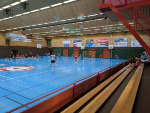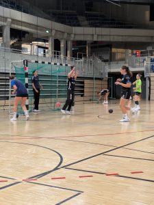 Pause war dann nur kurz, um die Tanks (mit Pizza, Salat und Obst) wieder zu füllen, bevor es zur zweiten „echten“ Trainingseinheit des Tages ging. Diese fand zusammen mit der JSG Heidelberg im SNP-Dome statt. Zeit, die imposante Spielstätte (unter anderem der Rhein-Neckar-Löwen) zu bestaunen blieb aber nicht – das laufintensive Training durch den Trainer der JSG forderte die volle Konzentration der Spielerinnen.