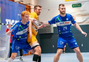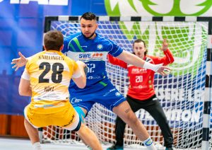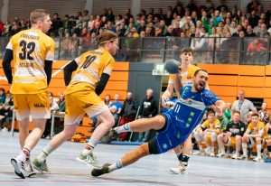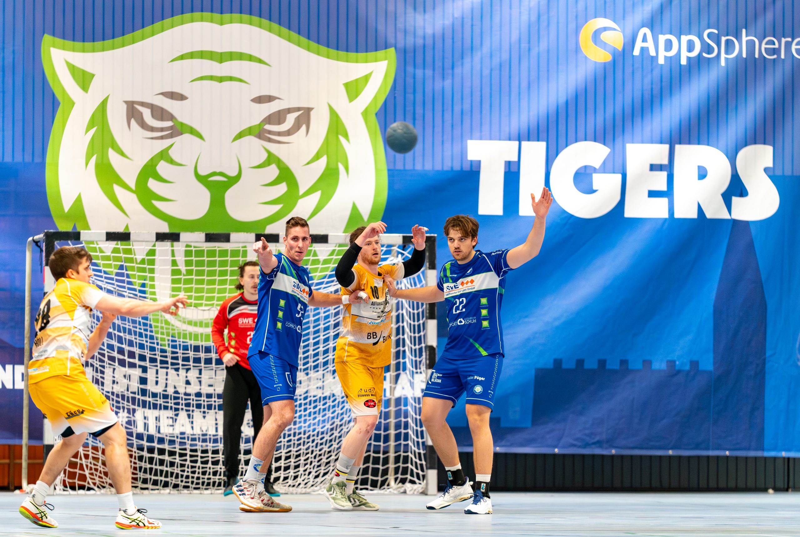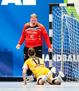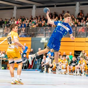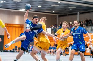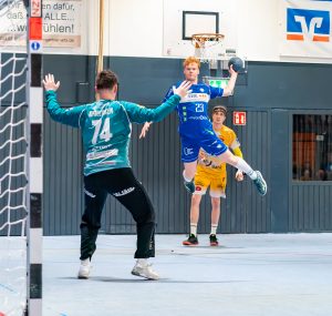 Den Torreigen für die zweite Halbzeit eröffnete der Knielinger Rückraumschütze Philipp Reither und signalisierte damit, dass sein Team sich für den zweiten Durchgang eine andere Performance vorgenommen hatte. Die Gäste agierten in der Defensive wesentlich offensiver und auch aggressiver, was den Angreifern der HSG ganz und gar nicht schmeckte. Es fiel den „Tigers“ in den zweiten dreißig Minuten sichtlich schwer ihren Tempohandball weiter auf die Platte zu bringen. Vincent von Witzleben, der an diesem Abend mit elf Treffern der herausragende Werfer war, fand: „dass wir heute schon mehr gute Lösungen gegen diese Deckungsart bieten konnten. Wir arbeiten im Training intensiv daran, brauchen aber noch Zeit, bis es auf dem Spielfeld umgesetzt werden kann.“ Der Meyer Sieben unterliefen nach dem Seitenwechsel unnötige Ballverluste in der Vorwärtsbewegung, die Knielingen umgehend bestrafte. Die Hausherren lebten alleerdings von dem großen Vorsprung, den sie sich in Hälfte eins erarbeitet hatten und konnten so auch die Ruhe bewahren. In der Abwehr traten einige Unsicherheiten auf, denen Daniel Meyer entgegenwirken wollte, indem er mit Luis Lagasse einen Wechsel auf der Torhüterposition vornahm. Ein Glücksgriff, wie sich herausstellen sollte. Luis war in der Schlussviertelstunde der große Rückhalt und lieferte einige spektakuläre Paraden ab. Unter anderem wehrte er einen Strafwurf von Robin Hildenbrand ab und entschärfte auch noch den Nachwurf. Im nächsten Angriff trat TVK Spielertrainer Dennis Estedt zum Siebenmeter an und scheiterte ebenfalls an Luis Lagasse. Die Torhüter der „Tigers“ brachte es in seiner Einsatzzeit auf acht Paraden und verhinderte, dass die Gäste noch näher herankamen. Raphael Blum zeigte im zweiten Durchgang, dass er für die Meyer Sieben eine Verstärkung werden kann. „Ich habe bis jetzt nur wenige Einheiten mit dem Team trainiert. Es fehlt mir noch die Abstimmung in bestimmten Situationen. Ich denke, dass dies aber immer besser wird“, kommentierte der gebürtige Pforzheimer seinen Einstand.