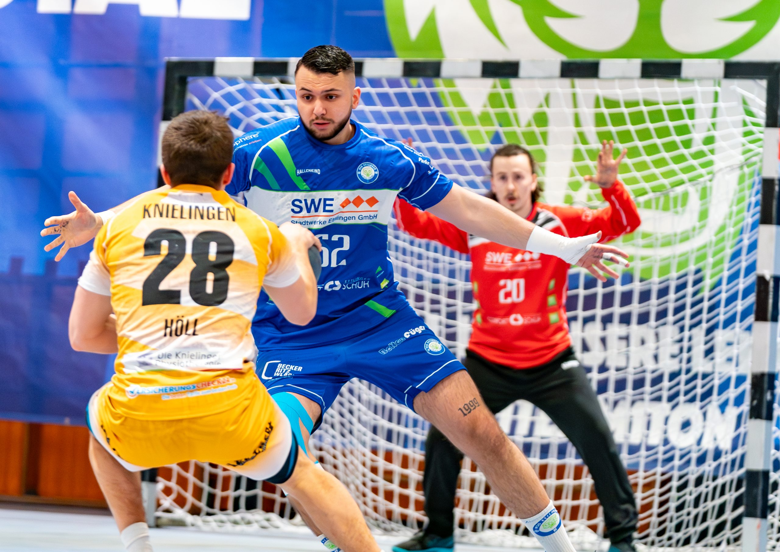 In der ersten Hälfte sahen die erstaunten Zuschauer eine sehr einseitige Begegnung. Die Gastgeber hatten sich von der Partie in Heddesheim sehr gut erholt und eröffneten die Partie gegen das Team aus dem Karlsruher Westen mit sehr viel Selbstbewusstsein. Trainer Meyer hatte für seinen ersten Auftritt im Wohnzimmer der HSG das Team blendend eingestellt. Zum ersten Mal hatte der Tabellenvorletzte den lange vermissten Nick Kusch und Neuzugang Raphael Blum mit dabei. Die Hausherren wirkten vom Anpfiff weg sehr konzentriert und arbeiteten in der Deckung sehr effektiv, do dass die Gäste nicht richtig ins Spiel fanden. Hinzu kam noch, dass Torhüter Florian Steinbach einen Sahnetag erwischte. Er sorgte mit zwölf Paraden in der ersten Hälfte dafür, dass Knielingen auf ganze acht Treffer kam. Die Offensive wirkte unter der Führung von Nick Kusch wie ausgewechselt und produzierte nur wenige technische Fehler.