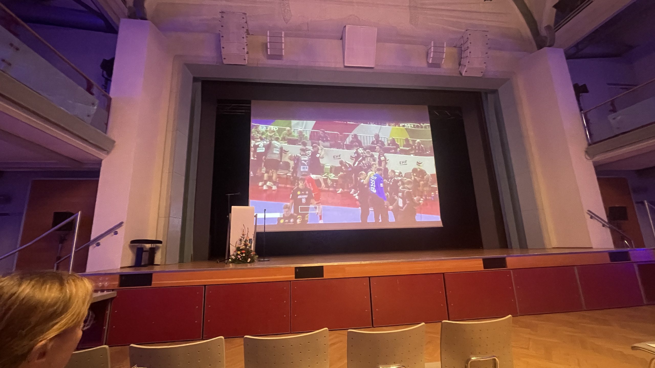 Nach dem offiziellen Ende der Ehrung verwandelte sich die Stadthalle in eine Public-Viewing-Arena, denn das Handball-Halbfinale Deutschland gegen Dänemark wurde ab 20:30 Uhr übertragen. Das freute alle anwesenden Handballfans, die nicht nach Hause hetzen mussten, sondern sich mit einem Getränk und Leckereien vom Buffet das spannende Spiel anschauen konnten.